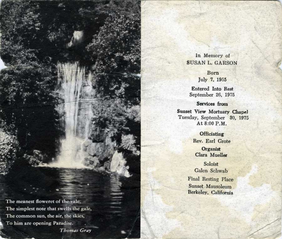 Susan Garson died in September of 1975. She and "the boyfriend" were taking classes at CCC during the 74-75 school year. The rumor was she was poisoned by her then boyfriend but the Contra Costa County Coronor's Office ruled her death as a suicide by poison. Sounds like a mystery. (In other words I'm not sure anybody knows what really happened.) It's a sad case either way. If anyone has better details, please contact the webmaster. ****** 1/5/2008 I found a link to more info about Susan on her brother's website.